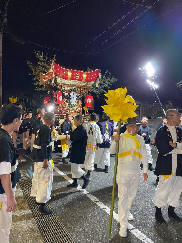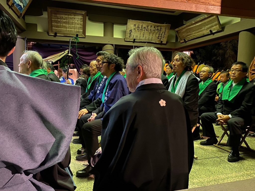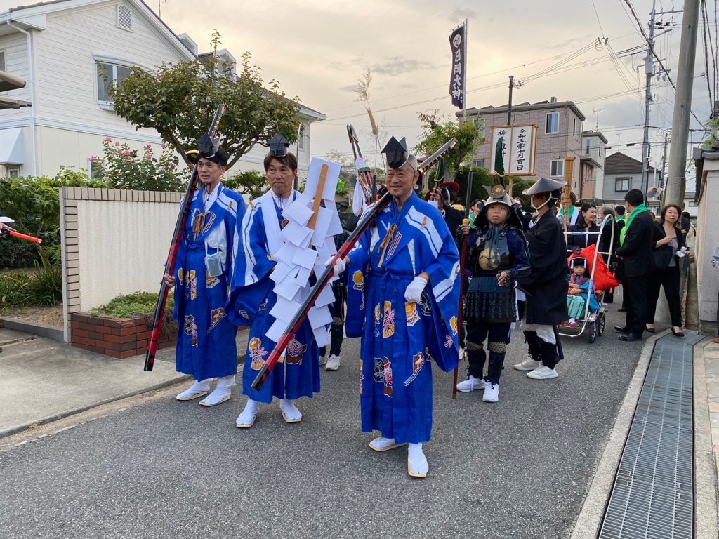 2023.10.7 日岡神社例祭宵宮 2023.10.17 日岡神社で一年に一度行われる特別な祭り(例祭)で、旧溝之口村(溝1、溝2、溝3、東溝)は祷人を出す大事な役割を担うことになりました。祭礼実行委員は長い時間をかけて準備をしてこの日を迎えました。行列を組み、祷人を神社へお連れして神事を執り行いました。 2023.10.15 大歳神社祭礼、福引 前の記事 2023.10.8 日岡神社例祭 本宮 次の記事