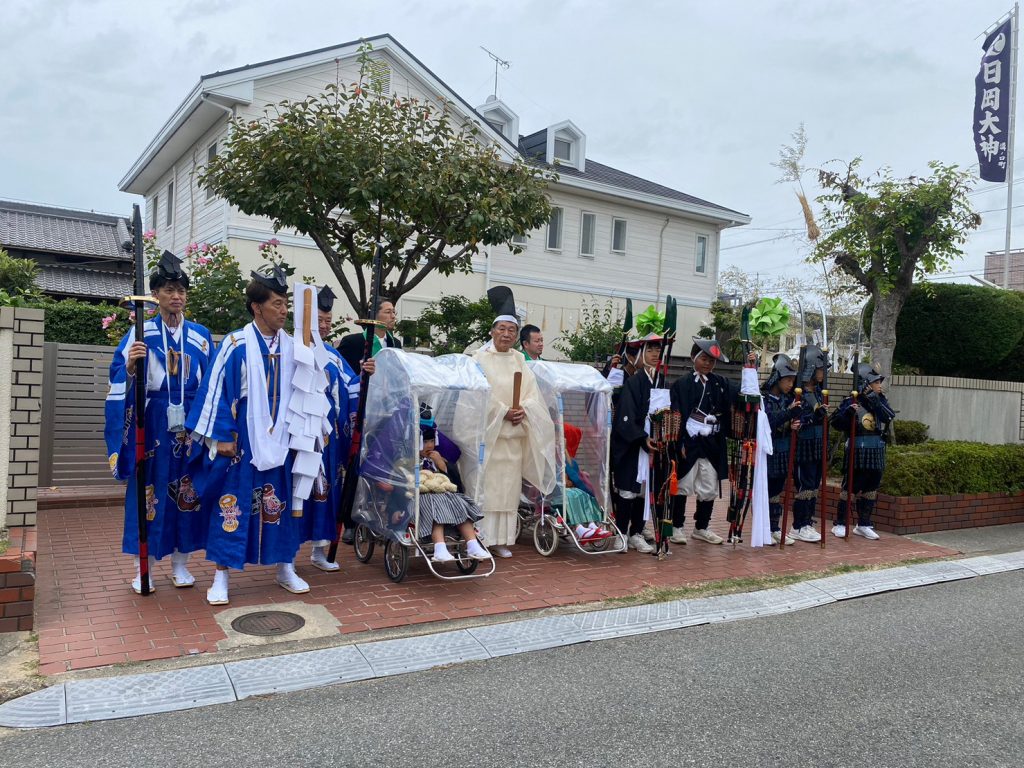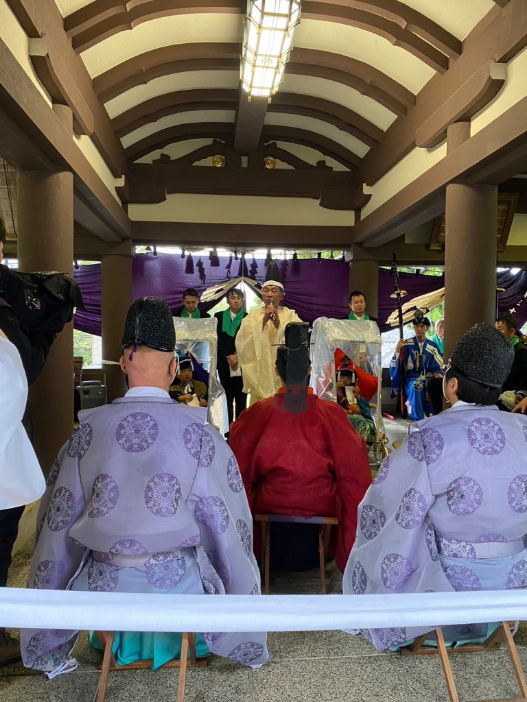 本宮当日は途中から冷たい雨が降るあいにくの天気でしたが、無事に祷人行列を神社まで送り届け、我々は大役を果たしました。