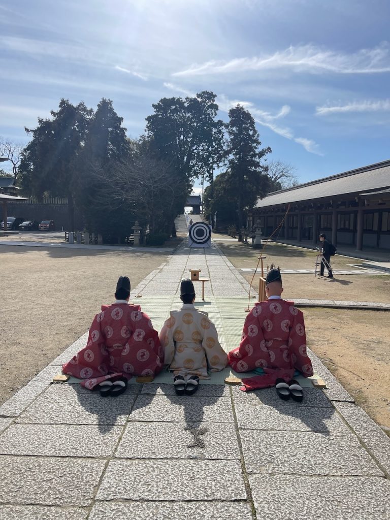 その後神社の境内にて的射の神事が行われ、溝3町内会からは鈴木副会長が代表として弓を射ました。試射なしでは難しく、2射とも右に逸れてしまいました。。
